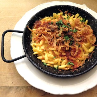 Swabians love their Spätzle, a type of pasta. For centuries now, they have made Spätzle at home —as a side dish to roasts with lots of gravy or as a standalone dish coming with cheese or sauerkraut, for instance. The dough is traditionally mixed —not kneaded— using flour, eggs, water and salt. Mix one pound of flour (use special Spätzle flour; it is less lumpy), at least five eggs, salt and water (as needed), and beat until the dough becomes smooth and chewy. In batches, the dough is then scraped or shaved directly into simmering salted water. According to the traditional method, the dough must be placed on a board flattened at the front; later, with a special Spätzle scraper, it is cut into thin strips and put into the boiling salt water. On a Spätzle shaver, you push a slide back and forth, and the dough will fall through holes into the water below. If the holes are round and smooth, you get short, thick Spätzle; if they have noses pointing downward, you have long, thin Spätzle. Today there are Spätzle shavers in very different designs, but the dough is always spread through holes into the water. As a standalone dish, Spätzle are served with cheese and stewed onions, the so-called Kässpätzle (cheese Spätzle). Or they come mixed with sauerkraut and bacon as Krautspatzen (Sauerkraut Spätzle); or with lentils and sausages, or… Spätzle are still a cult dish in Swabia today.
