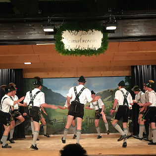 Men in Lederhosen (short leather pants) stand in a circle; their embroidered suspenders and shoes are also made of leather; they wear white linen shirts, loden hats decorated with Gamsbart (tuft of chamois hair) and knitted wool calf warmers. The dancers hold their bent arms up in front; as soon as the music hits three-quarter time, they pull up their knee and jump from one leg to the other, and then slap with their hands alternately their thighs, their knees or the soles of their shoes. They stomp with their leather shoes on the ground and cheer loudly. They are dancing the Schuhplattler, which means “shoe slapping”. The synchronised, rhythmic slapping and stomping reminisces of modern body percussion. Schuhplattler is a purely male dance intended to impress women. It has been danced in South Tyrol, southern Bavaria and parts of Austria for over a century. The Schuhplattler is still performed at many church and traditional festivals today, being also taught and passed on in many traditional costume clubs (Trachtenvereine). The posing behaviour reminds us of the behaviour of a capercaillie, which dances in a circle with raised tail feathers and makes loud clicking sounds to impress the female bird. Hence the belief that the capercaillie inspired the Schuhplattler.