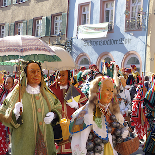The jesters can get up to mischief under their disguise. They take on a new identity and play a role that has nothing to do with their everyday lives. Strongholds of the “Fasnet" (the nights before Lent) are Rottweil, Villingen, Riedlingen, Bad Waldsee, etc. Each jesters´ guild cultivates its own customs. In Rottweil, a jesters´ leap takes place on Shrove Monday at 8:00 a.m., in Riedlingen, a meal of “tripe of frogs“ is celebrated on Shrove Tuesday. Fasnet has become increasingly popular since the 1960s. So popular, in fact, that the Rottweil Jesters' Guild is even discussing restrictions on admission. Television and radio report on the events with thousands of spectators.