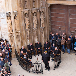 Indications exist that the Romans already had a judicial body which fulfilled this function, its activity being confirmed in Islamic times too, possibly since the tenth century. Valencia's Water Court —Europe’s oldest legal institution— is formed by a bailiff and eight trustees or representatives from the main irrigation ditches of the Turia River, farmers chosen by the irrigators who, despite lacking legal training, are highly knowledgeable about the unwritten and orally transmitted rules. The Water Court meets on Thursdays at noon, as it was customary among Muslims after the end of the weekly market prior to their holy day. Unlike them, the Christians did not impart justice in temples; however, they maintained the activity of this court at the Door of the Apostles of the Cathedral of Valencia, which enjoys the shade all year round at that time of day.